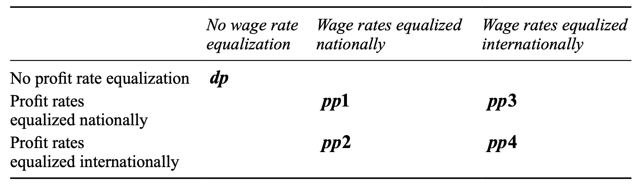 Accordingly, value transfers arising from differential capital compositions (δ1) can be expressed as the difference between (pp2′ − dp’), while value transfers resulting from differential rates of surplus value (δ₂) can be expressed as (pp2′ − pp4′). The total transfer of value generated by the emergence of international prices of production is therefore the sum of these two effects, δ= δ₂ + δ₂.