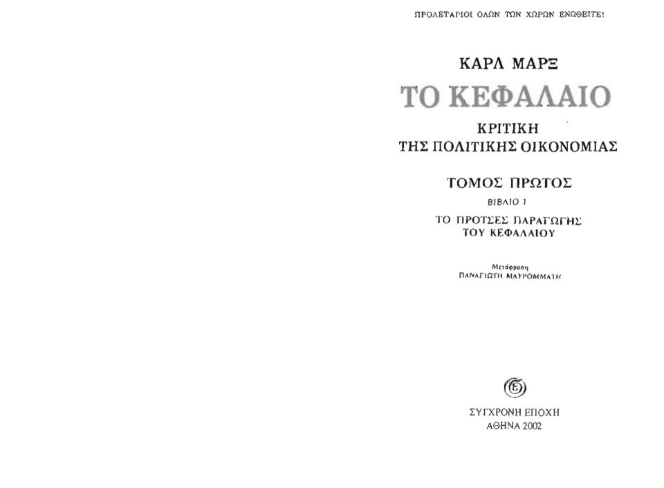 On the other hand, the lawyer Ioannis Skouriotis published, independently from the aforementioned team, in 1954, 1957, and 1960, in Athens, the three volumes of Das Kapital (‘with editorial notes’), trying to combine conceptual clarity with the so-called ‘demotic’ vernacular idiom. The result was formidable in its accomplishment but (today) as good as unreadable. Anyway, Skouriotis’ edition did not remain for long in the book market, leaving thus the so-called ‘Mavromatis translation’ (comprising also the Theories of Surplus-Value) as the sole translation of Das Kapital for the Greek public. This edition remained unchanged, even in its typesetting, for the rest of the century and into the current one.