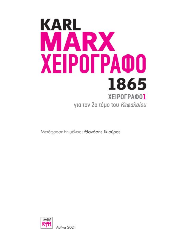 After the publication of the Anthology of the 1850s, the next step focused once again on Das Kapital. Since the second section of the MEGA, containing all the manuscripts of Kapital, had been completed in 2012, the decision was made to introduce the Greek public to this aspect of Marx’s work, an aspect that was largely unknown in Greece. Accordingly, the so-called Manuscript 1865, the first manuscript for the second volume of Kapital, was translated and edited by Thanasis Giouras (based on MEGA vol. II/4.1) and published in 2021. This edition was one of only a few published worldwide, but it will be some time before it gains any notable recognition.