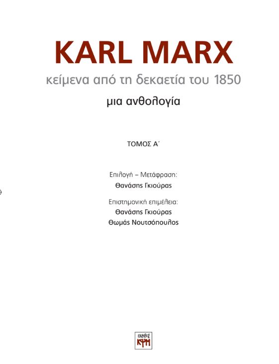The volume also featured ‘classical’ texts such as Class Struggles in France (Die Klassenkämpfe in Frankreich), The Eighteenth Brumaire of Louis Bonaparte (Der achtzehnte Brumaire des Louis Bonaparte), the Urtext of 1858, and selected excerpts from the Grundrisse. A number of works were translated into Greek for the first time, including Enthüllungen über den Kommunisten-Prozeß zu Köln (Revelations on the Communist Trial in Cologne), Lord Palmerston, Lord John Russell, and the infamous Revelations of the Diplomatic History of the 18th Century (Enthüllungen aus der diplomatischen Geschichte des achtzehnten Jahrhunderts). The anthology was published in two volumes in 2018. The translation was undertaken by Thanasis Giouras, with Thomas Noutsopoulos contributing to the editing of the Grundrisse and the Urtext.